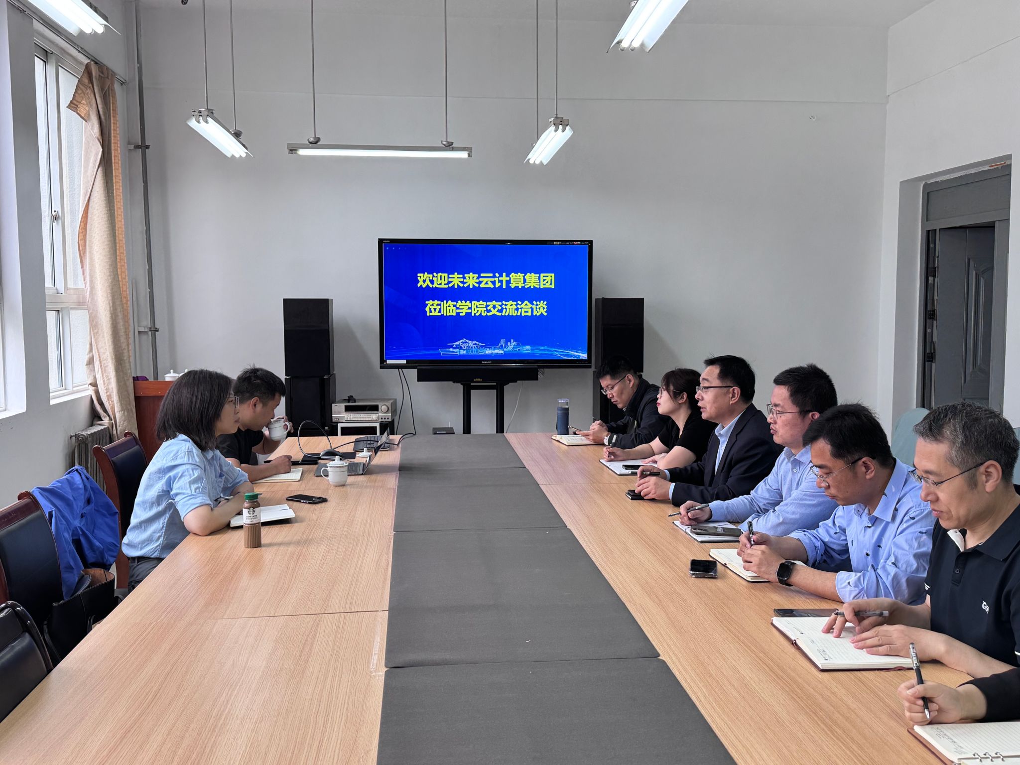 盖延亮介绍了学院专业设置、师资力量、教学成果及发展规划,强调学院以培养高素质人工智能技术人才为目标,强化实践教学,提升学生动手能力和创新思维。杨骐榛、解磊介绍了山东未来云在云服务、人工智能技术应用等方面的优势,表达了合作意愿,希望为学校提供优质资源和解决方案。