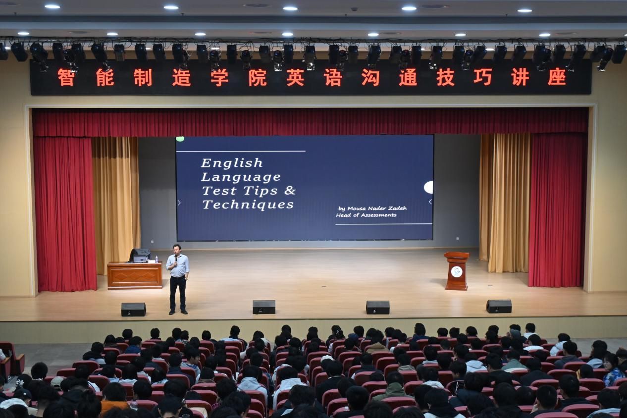 11月24日,青岛港湾职业技术学院智能制造学院在学术报告厅举办英语沟通技巧讲座。英国诺森比亚大学语言考试中心主任穆萨·纳德尔·扎德(Mousa Nader Zadeh)担任主讲人,张圣杰老师主持讲座,500余名学院师生共同参与。本次讲座旨在助力学生提升英语沟通能力、拓宽国际学术视野,为有志于英语学习的学生搭建学习交流的优质平台。